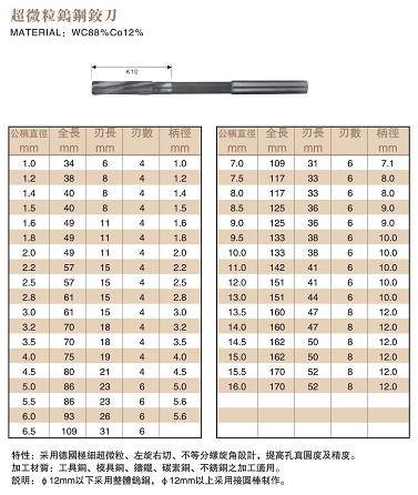 商品编号: 72-61 商品特点:采用德国径细超微粒、左旋右切、不等分螺旋角 设计提高孔真圆度及精度。